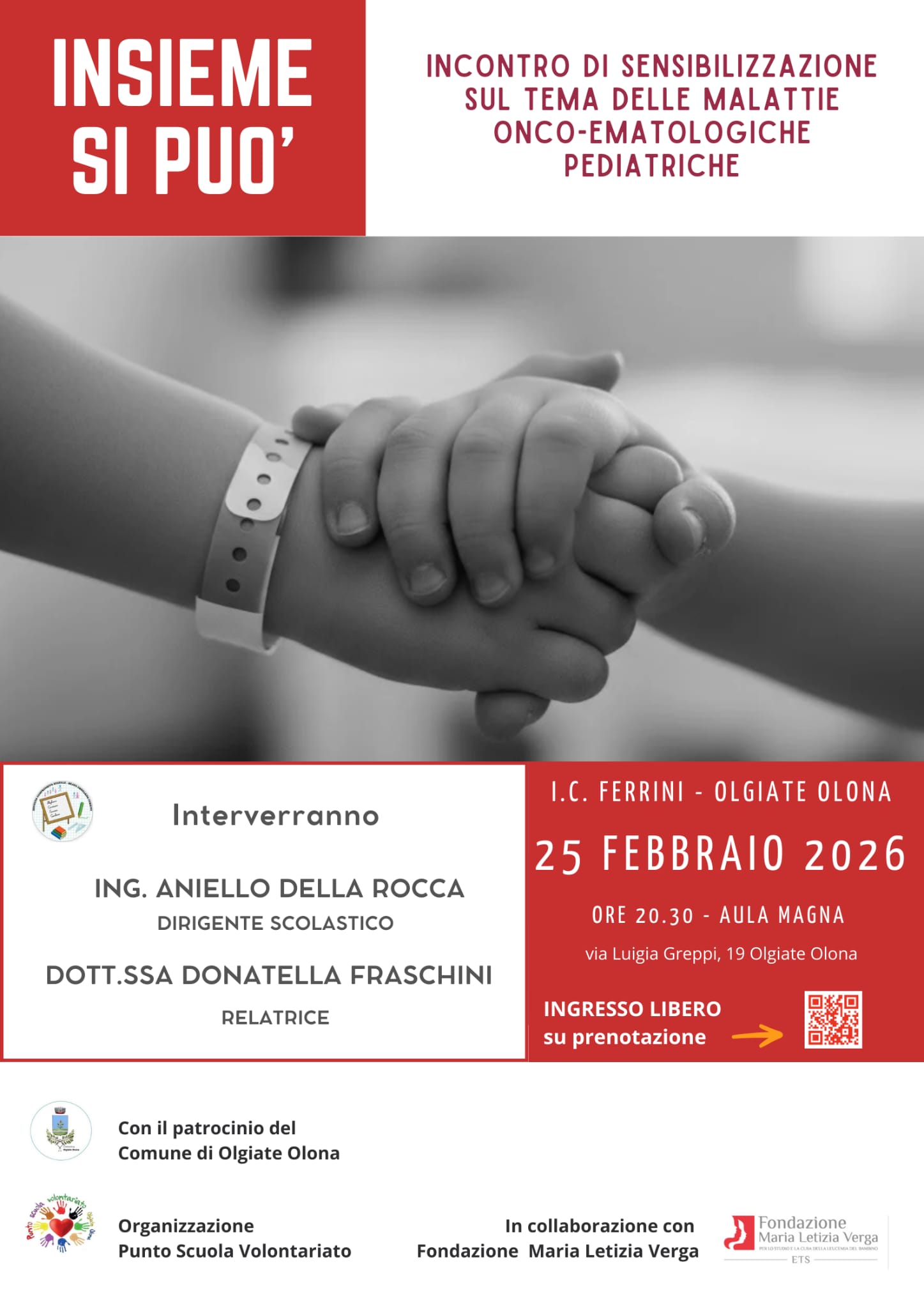 Il Comune informa la cittadinanza che mercoledì 25 febbraio 2026, alle ore 20:30, presso l’Aula Magna dell’I.C. Ferrini di Olgiate Olona (via Luigia Greppi, 19), si terrà l’incontro di sensibilizzazione "INSIEME SI PUÒ".