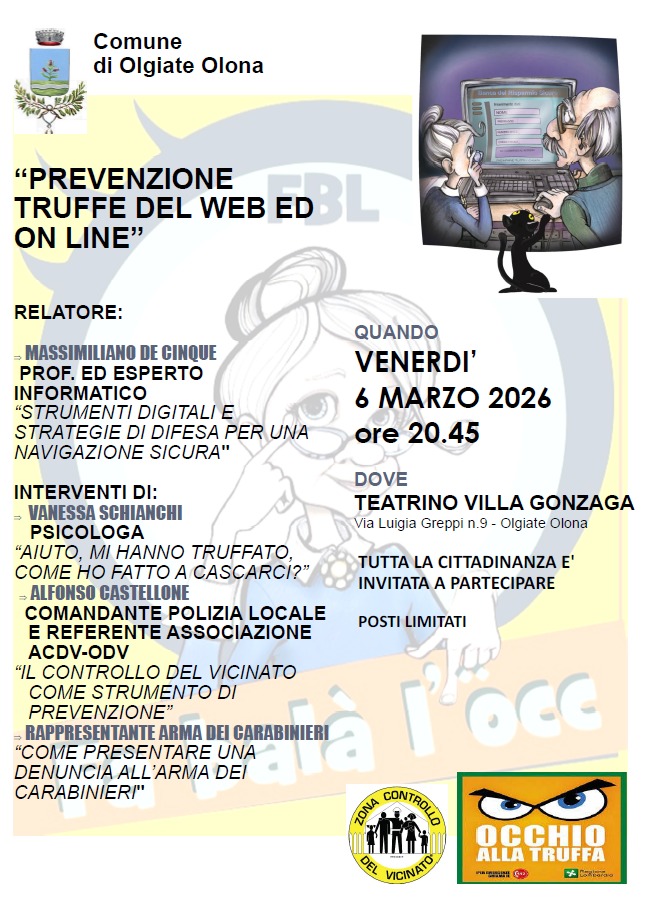 L’obiettivo dell’incontro è fornire strumenti concreti, consigli pratici e indicazioni operative per riconoscere i tentativi di raggiro, proteggere i propri dati personali e sapere come agire in caso di truffa.