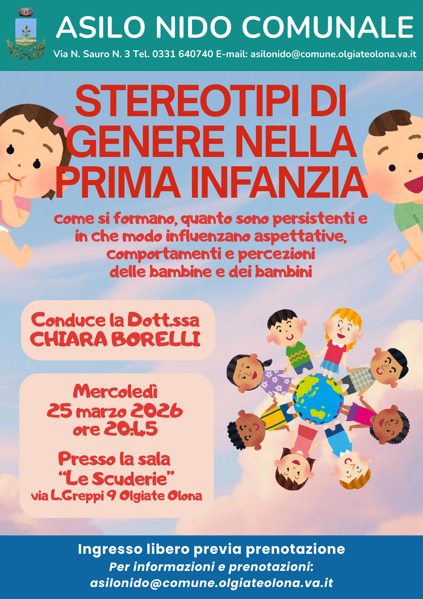 L’incontro, condotto dalla Dott.ssa Chiara Borelli, offrirà spunti di riflessione e strumenti utili per comprendere come gli stereotipi di genere si sviluppano fin dai primi anni di vita e come possano incidere sulla crescita, sulle relazioni e sulla costruzione dell’identità di bambine e bambini.